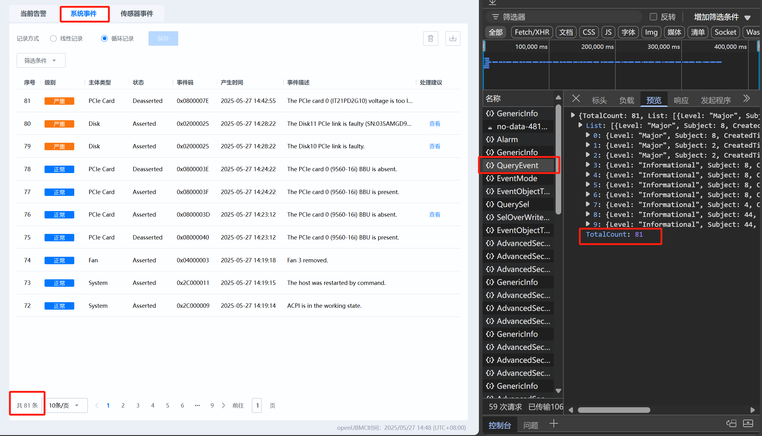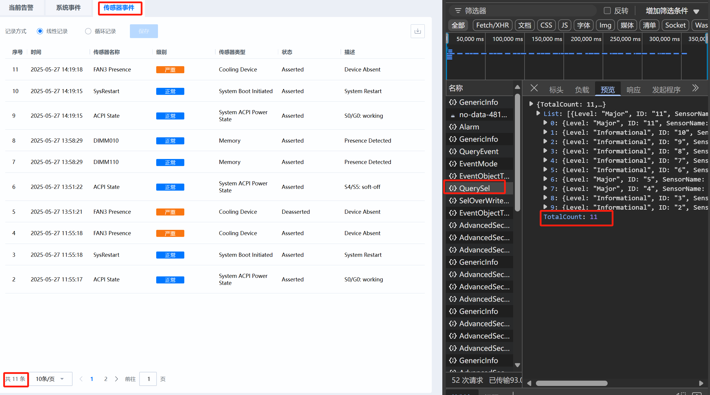 在bmc web的维护诊断页面,有系统事件和传感器事件两种日志,SEL是系统事件日志,按理说指代就是web上系统事件这个日志。但是我使用命令ipmitool sel elist 显示的内容与web上的传感器事件日志是保持一致的。然后我看两个的URL,系统事件的请求URL是/UI/Rest/Maintenance/QueryEvent,传感器事件的请求URL是/UI/Rest/Maintenance/QuerySel。然后看日志格式也是web上的传感器事件日志的格式更符合SEL事件格式。所以希望能有人解答一下。