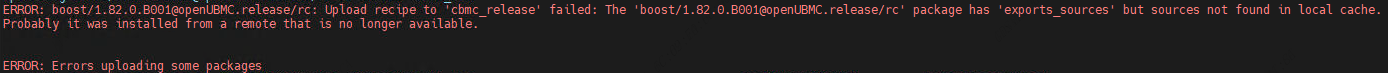 ERROR: boost/1.82.0.B001@openUBMC.release/rc: Upload recipe to 'cbmc_release' failed: The 'boost/1.82.0.B001@openUBMC.release/rc' package has 'exports_sources' but sources not found in local cache.