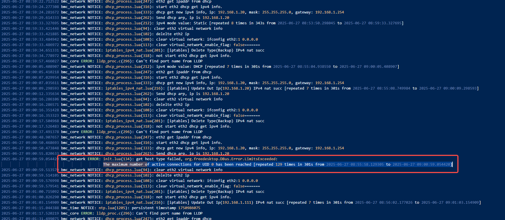 bmc_network ERROR: init.lua(134): get host type failed, org.freedesktop.DBus.Error.LimitsExceeded: The maximum number of active connections for UID 0 has been reached [repeated 129 times in 301s from 2025-06-27 08:55:58.129305 to 2025-06-27 09:00:59.054420]