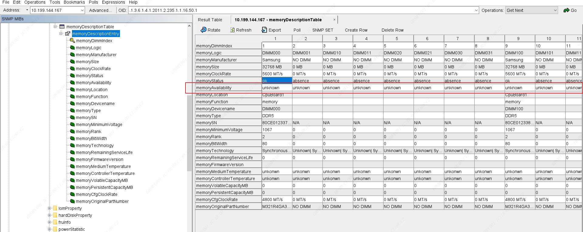 通过代码,看到rackmount/interface_config/snmp/mapping_config/memoryProperty.json中的memoryAvailability的值固定为1,请问这是否是问题?同样的还有memoryRemainingSericeLife/memoryVolatileCapacityMB等