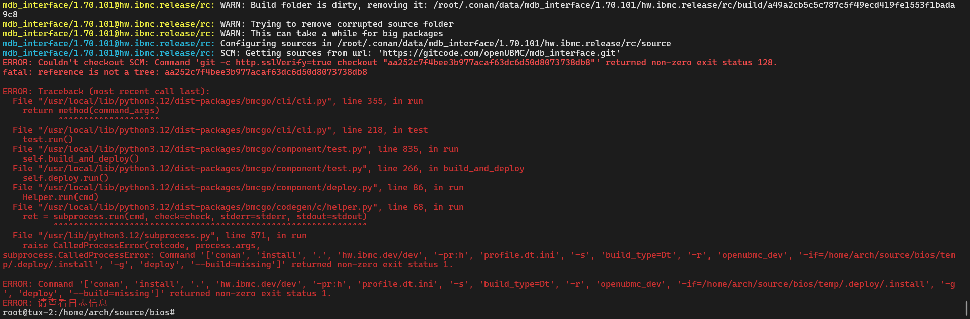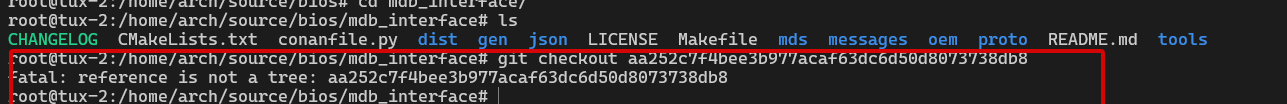 报错信息中指出 mdb_interface 仓库中的某个 commit(aa252c7f4bee3b977acaf63dc6d50d8073738db8)不存在,导致构建失败。查看 Git 仓库后,确实没有这个提交记录。