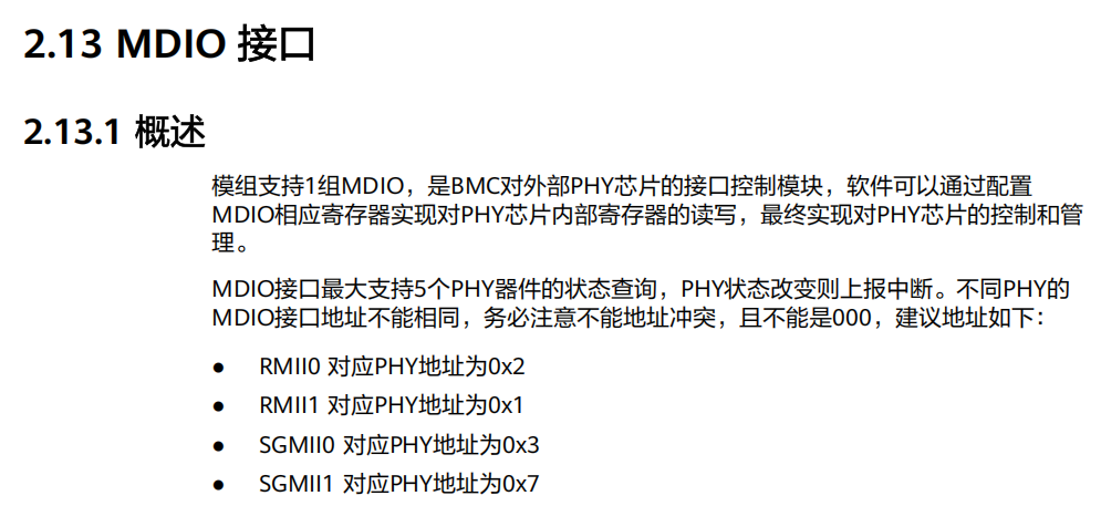 感谢回复,主要涉及到MDIO接口,模组手册上写到“软件可以通过配置MDIO相应寄存器实现对PHY芯片内部寄存器的读写”。顺便问一下,这里的软件应该是指BMC吧,BMC里面是怎么配置MDIO的?