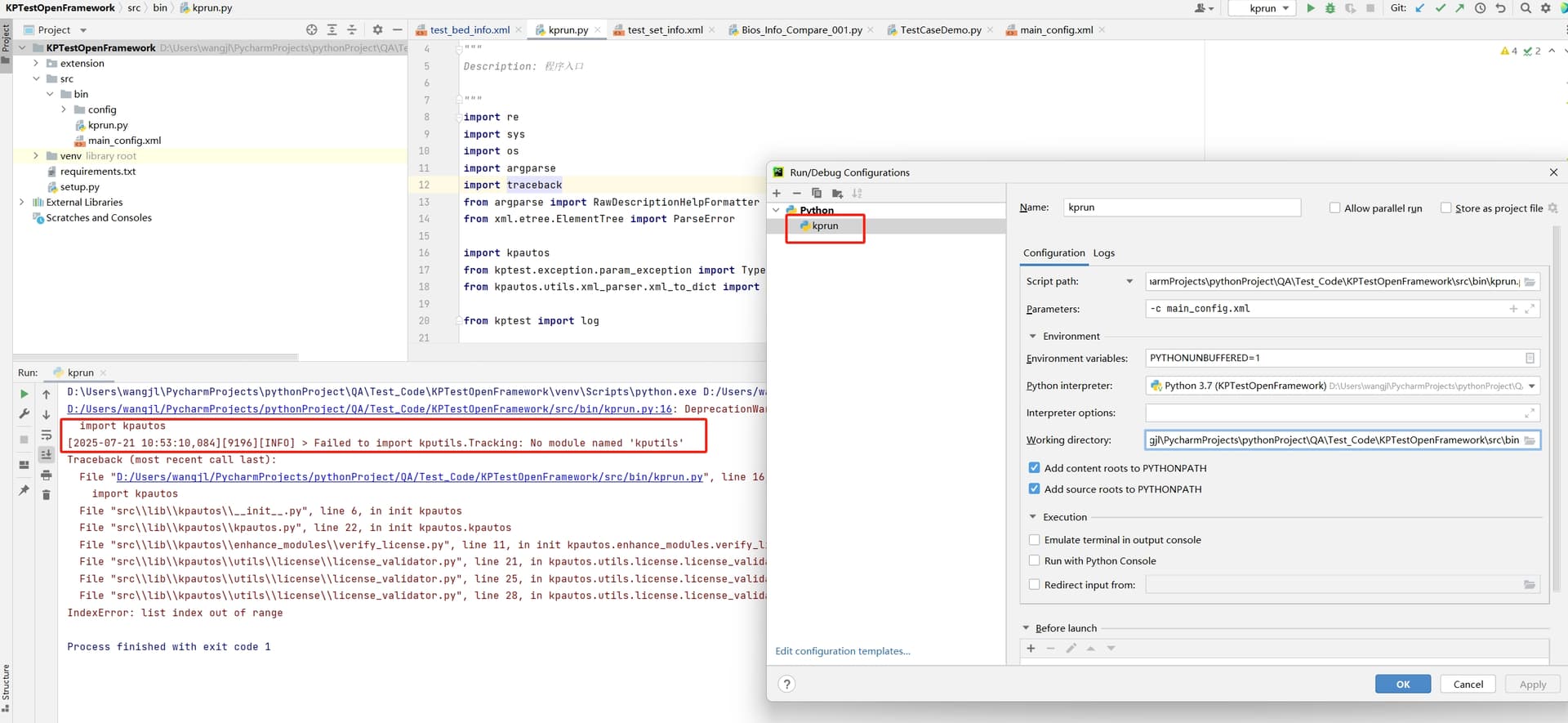 按照《 KPTest定制化用例开发指南》搭建kptest自动化开发框架,执行kprun报错。