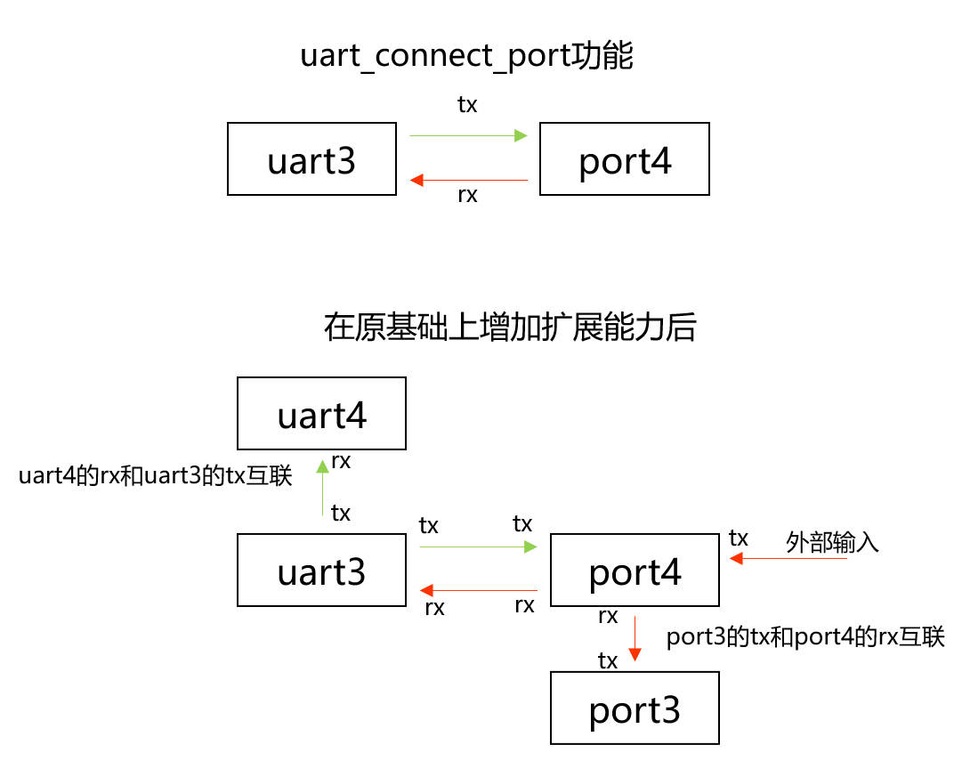 背景介绍:sdk原有的uart互联功能会同时将uart/port和uart/port的tx和rx同时建立通信,该能力框架已提供资源树方法“UartConnectUart",“UartConnectPort”,“PortConnectPort”。