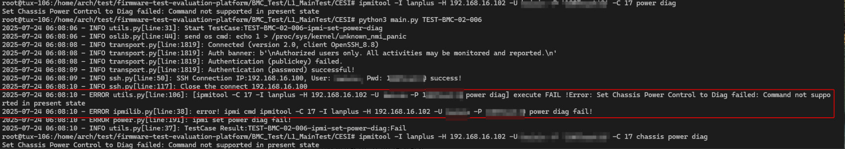 2025-07-24 06:08:10 - ERROR ipmilib.py[line:38]: error! ipmi cmd ipmitool -C 17 -I lanplus -H 192.168.16.102 -U xxxx -P xxxx power diag fail!