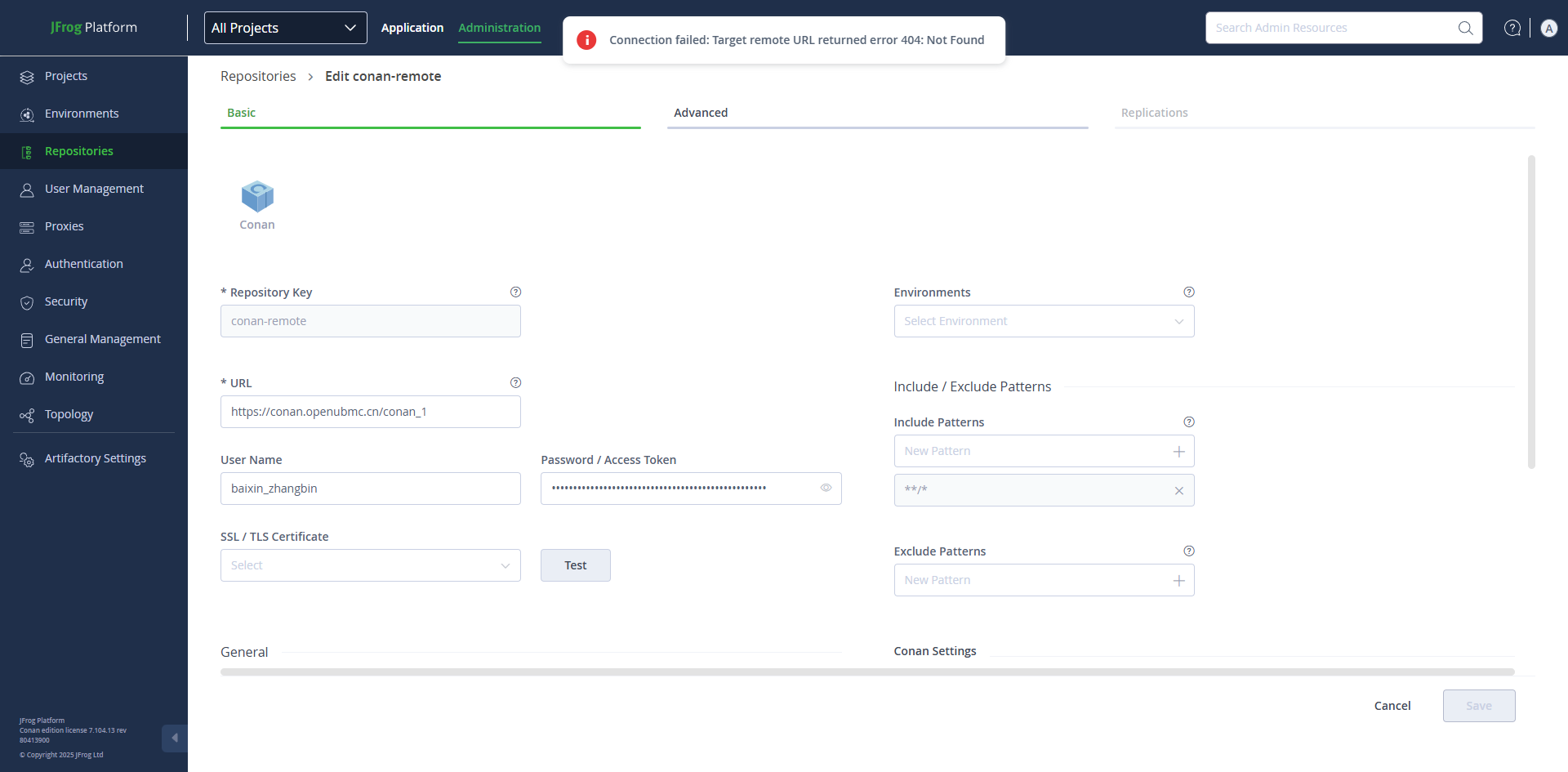当前Jfrog在尝试绑定https://conan.openubmc.cn/conan_1 仓库时,虚拟仓库中无法获取远程社区仓库中的conan包,在点击页面test后出现