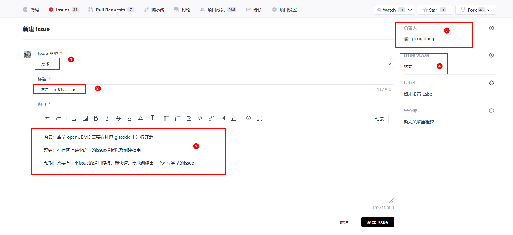 第三步,填写 issue 的内容,并且点击 创建,如下图: