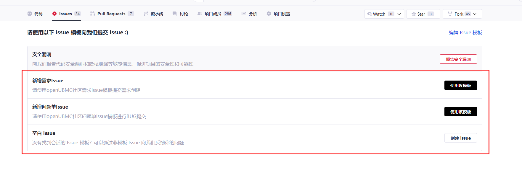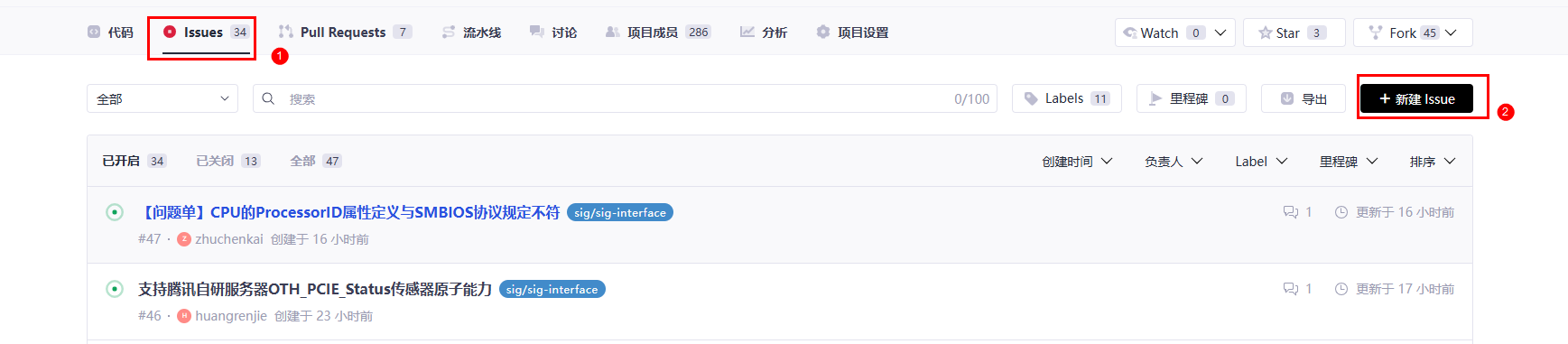 第一步,在对应的代码仓库的首页,进入到 issue 页面(如下图),然后点击 新建 issue:
