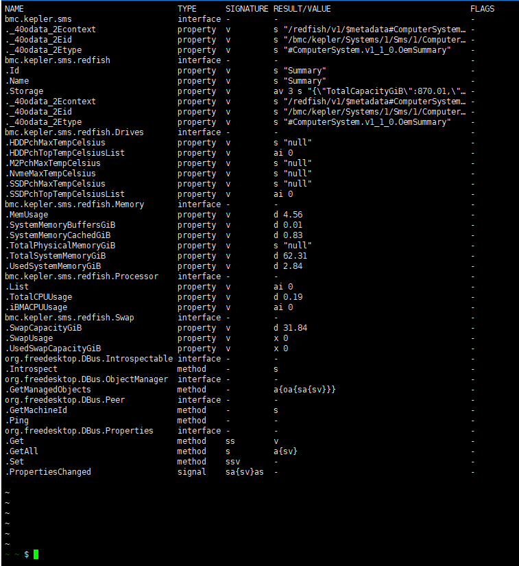1、在BMC后台执行 busctl --user introspect bmc.kepler.host_agent /bmc/kepler/Systems/1/Sms/1/ComputerSystem/Systems/1/Summary