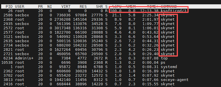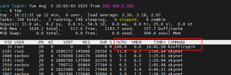 BMC起来后,空闲情况下即不进行任何操作,没有数据转发情况下ksoftirqd的CPU占有率就达到100%。将所有的skynet进程杀掉后ksoftirqd的CPU占有率立马就降下来了,所以初步怀疑ksoftirqd占用率高与skynet进程是强相关的,其他使用openubmc的同事是否也有该现象?哪位专家能帮忙解答下原因,该现象是否属于问题,感谢