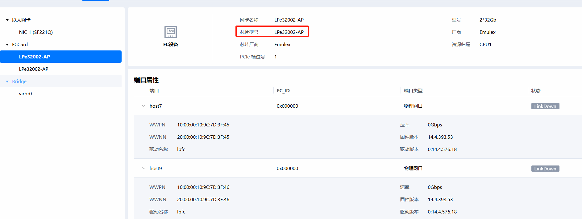 博通LPe32002-AP HBA FC卡的芯片型号在S920X20机型上显示有问题。当前显示为卡的名称,不是实际的芯片型号,芯片型号为XE501