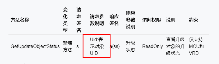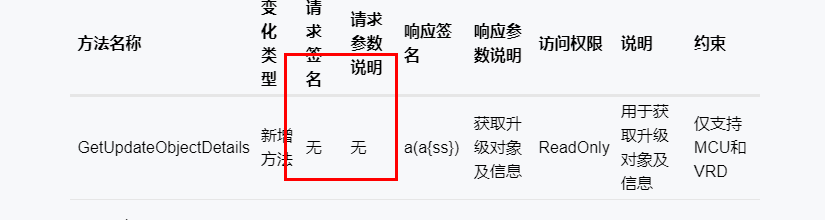| 方法名称 | 变化类型 | 请求签名 | 请求参数说明 | 响应签名 | 响应参数说明 | 访问权限 | 说明 | 约束 |