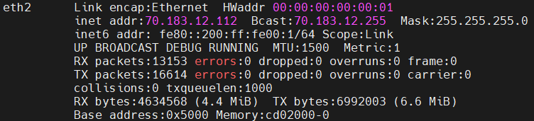 2、查看ifconfig,连接状态为RUNNING,CRC错误统计为0,说明硬件应该没问题