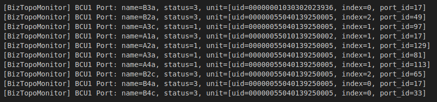 [BizTopoMonitor] BCU1 Port: name=B3a, status=1, unit=[uid=00000001030302023936, index=0, port_id=17]