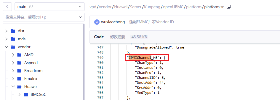 可通过社区vpd仓的 platform.sr 中的 IPMIChannel_ME 对象配置的 DestAddr 确定IPMB总线地址,如下可确认地址为 0x2c