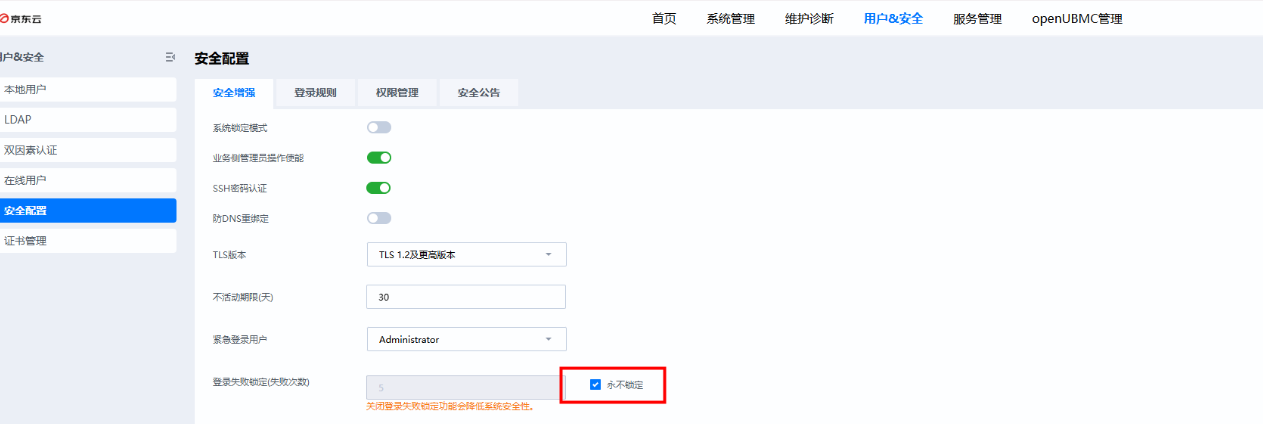 用于&安全→安全配置→安全增强→登录失败锁定(永不锁定)
