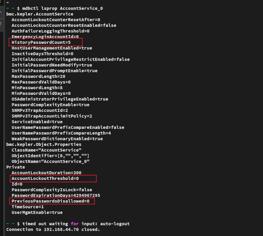 禁用历史密码 登录失败锁定(失败次数) 在account组件中,直接修改mds/model.json中HistoryPasswordCount和AccountLockoutThreshold、PreviousPasswordsDisallowed的值**,**之后自动生成代码,编译出包升级后发现不生效且恢复出厂设置后,默认值也是不符合预期,且后台查看属性值只是有部分有修改掉