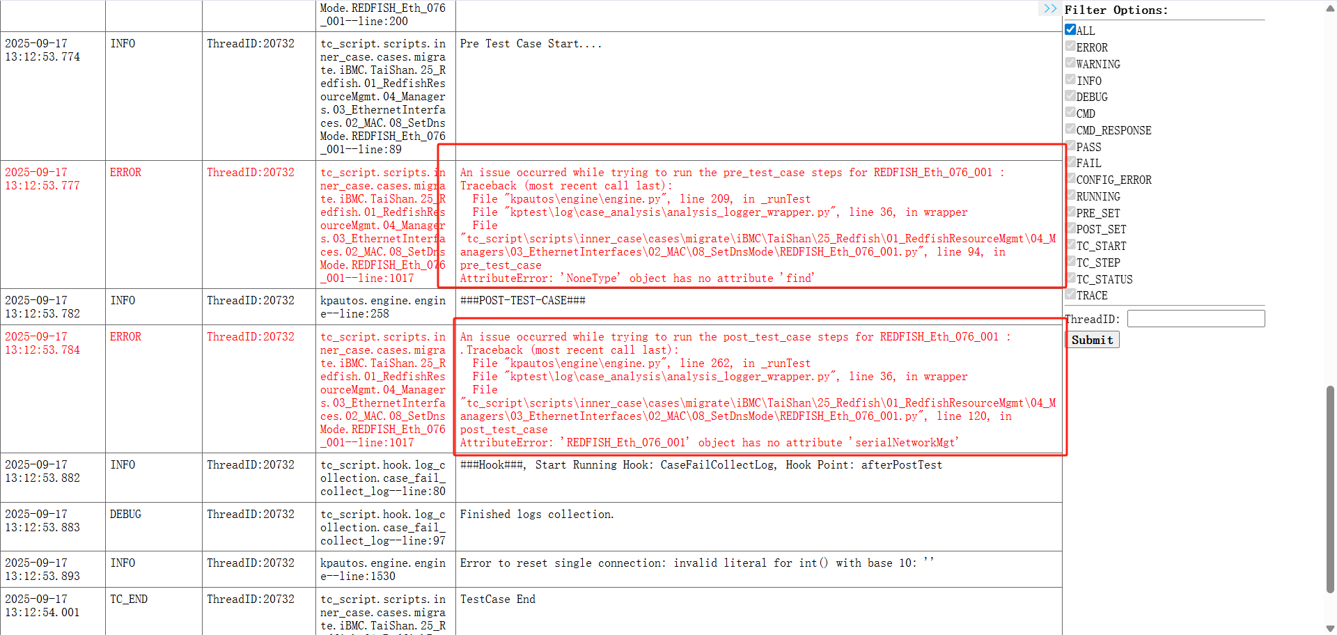 - `post_test_case` 抛出错误:`AttributeError: 'REDFISH_Eth_076_001' object has no attribute 'serialNetworkMgt'`