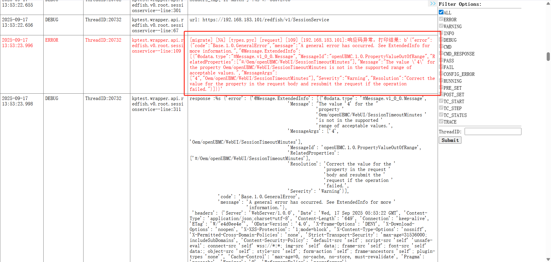 根据提供的测试日志,该问题发生在通过 Redfish 接口配置 Web 会话超时时间时。测试尝试将 SessionTimeoutMinutes 设置为 4 分钟,但系统返回错误信息: