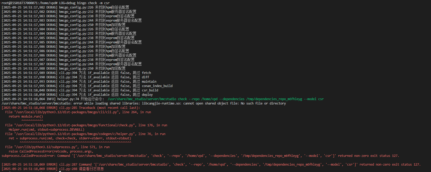 在vpd目录下执行bingo check -m csr 或者 LOG=debug bingo check -r ibmc_dev都会报错: