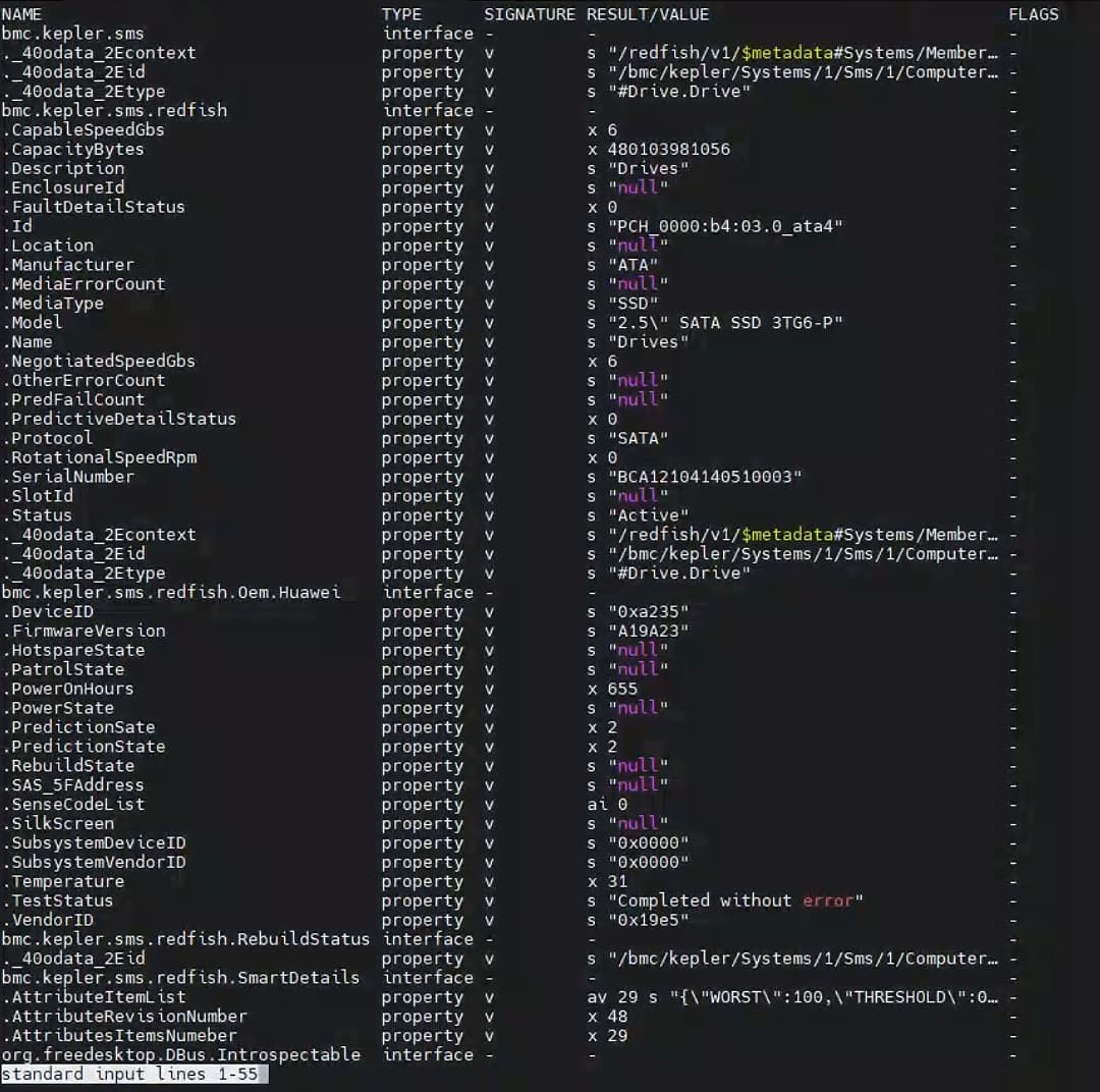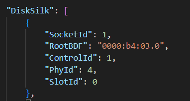 lspci -tv,获取 SATA 盘的真实 BDF。PcieAddrInfo_SAS 对象的配置,将其中的 Bus, Device, Function(即 RootBDF)修改为步骤1中获取的值。PcieAddrInfo_SAS 中的 phy_id 与 host_agent 报告的一致。host_agent 服务。host_agent 的 SilkScreen 字段是否仍为 null。打开bma白名单,访问redfish接口redfish/v1/Sms/1/Systems/1/Storage/1/Drives查询bma提供的信息,硬盘URI路径最后一个数字就是PhyId。