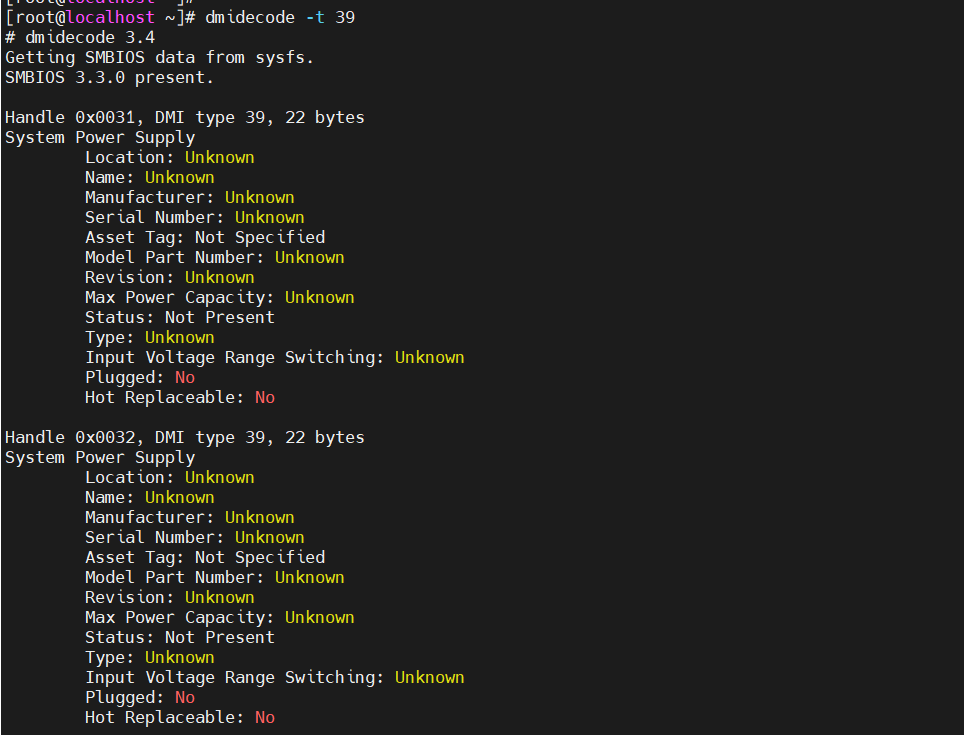 OS下执行dmidecode -t 39获取电源信息,回显全为Unknown。