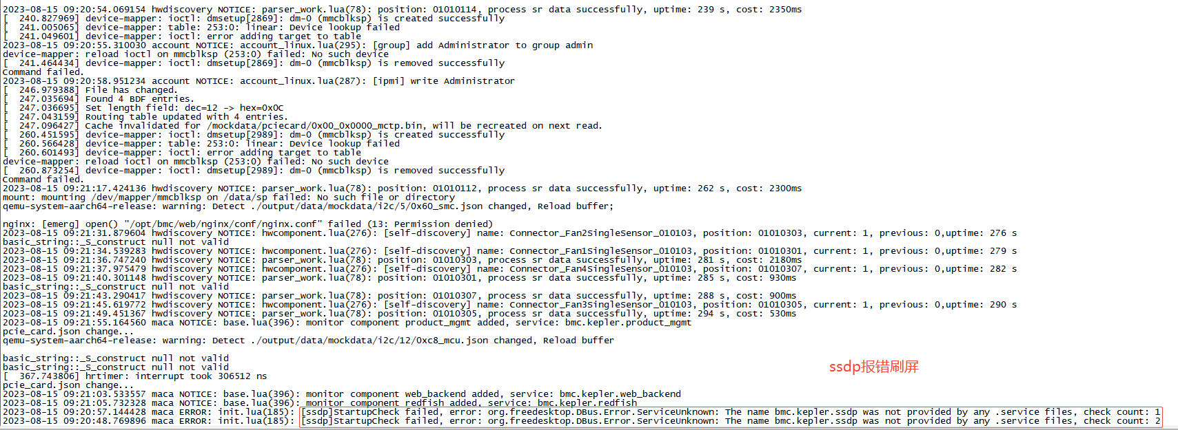 2023-08-15 09:21:04.953502 maca ERROR: init.lua(185): [ssdp]StartupCheck failed, error: org.freedesktop.DBus.Error.ServiceUnknown: The name bmc.kepler.ssdp was not provided by any .service files, check count: 117