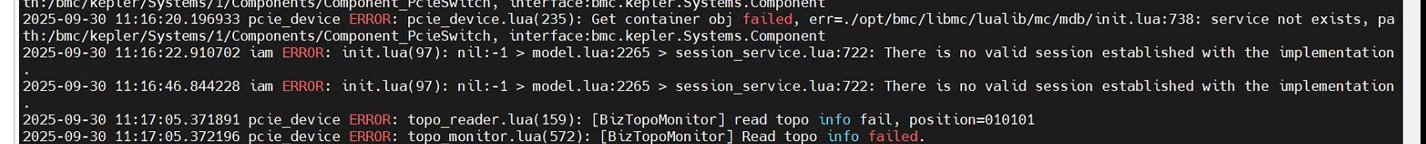 此外,pcie_device 组件报错提示无法获取资源树对象(如 /bmc/kepler/Systems/1/Components/Component_PcieSwitch),说明部分D-Bus服务尚未就绪或未正确注册,进一步影响了依赖这些服务的组件(如 iam)的正常运行。