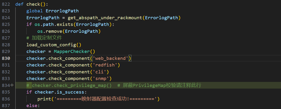 这个报错比较好解决,由于是个人出包我们可以直接绕开这个检查方法,找到文件rackmount/mapper_check/MapperCheck.py,屏蔽校验
