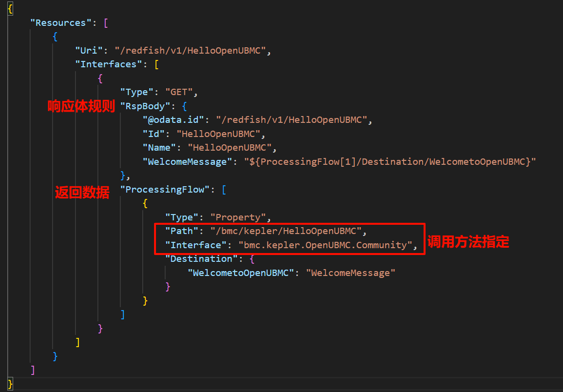 这里我们通过接口映射配置,不仅将Redfish的uri 资源进行了具体的定义,并将Redfish的uri 资源与openUBMC资源协作接口关联了起来,开发者无需再编写Redfish的接口代码逻辑。
