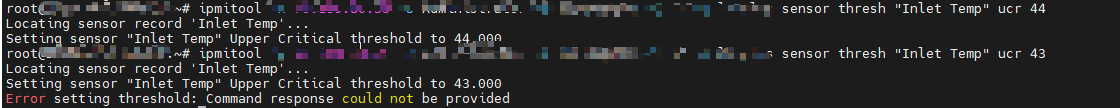 进风口温度门限配置为unc:41,ucr:43,正向迟滞量为2,使用ipmi命令将ucr设置为44,成功;再将ucr设置为43,失败