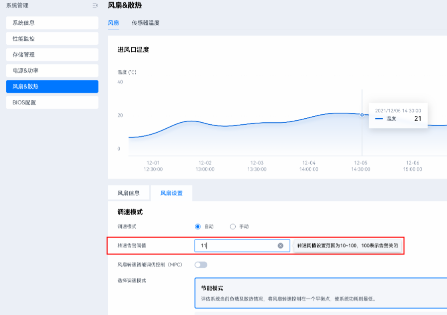 3、同意在“系统管理”/“风扇&散热”/“风扇设置”页面 ,“调速模式”页签下新增“转速告警阈值”字段(参考评审点描述)