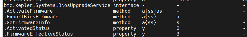 busctl --user --no-pager introspect bmc.kepler.bios /bmc/kepler/Systems/1/BiosUpgradeService