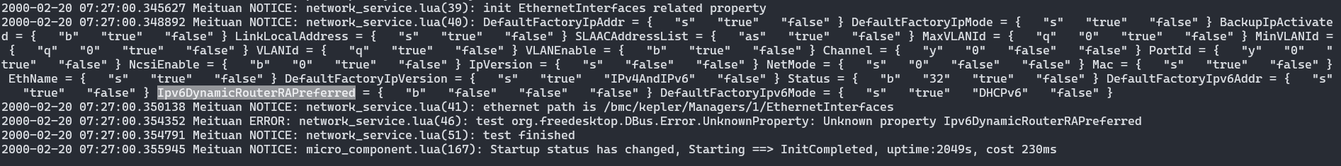 根据提供的信息,您在尝试通过 Lua 代码设置 Ipv6DynamicRouterRAPreferred 属性时遇到了 Unknown Property 错误(org.freedesktop.DBus.Error.UnknownProperty: Unknown property Ipv6DynamicRouterRAPreferred),但通过 busctl introspect 命令可以确认该属性确实存在于 D-Bus 接口上,并且日志中也打印出了该属性。这表明属性本身是存在的,问题可能出在访问或设置方式上。