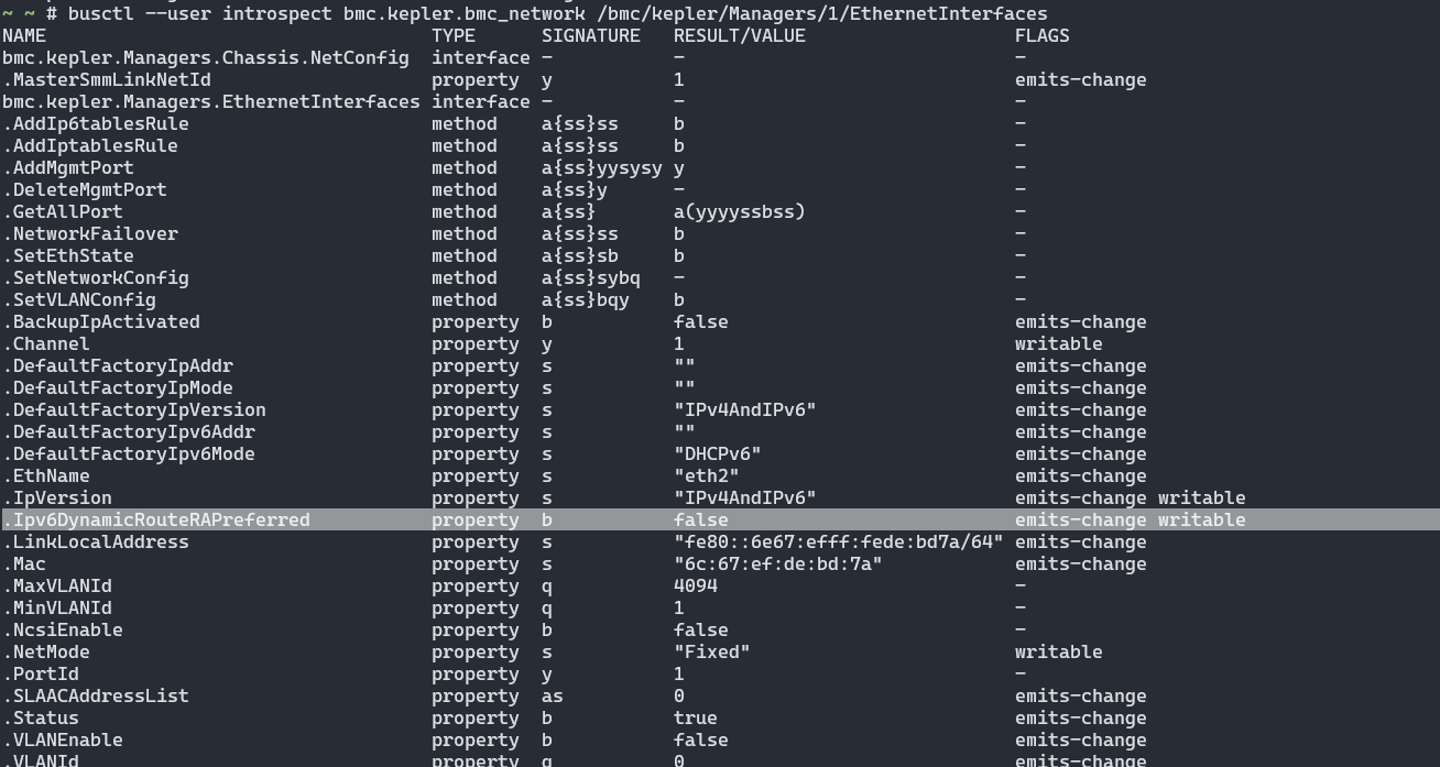 注意到属性名中的 RAPreferred 部分,而根据 busctl 输出的接口信息,实际属性名为:Ipv6DynamicRouteRAPreferred