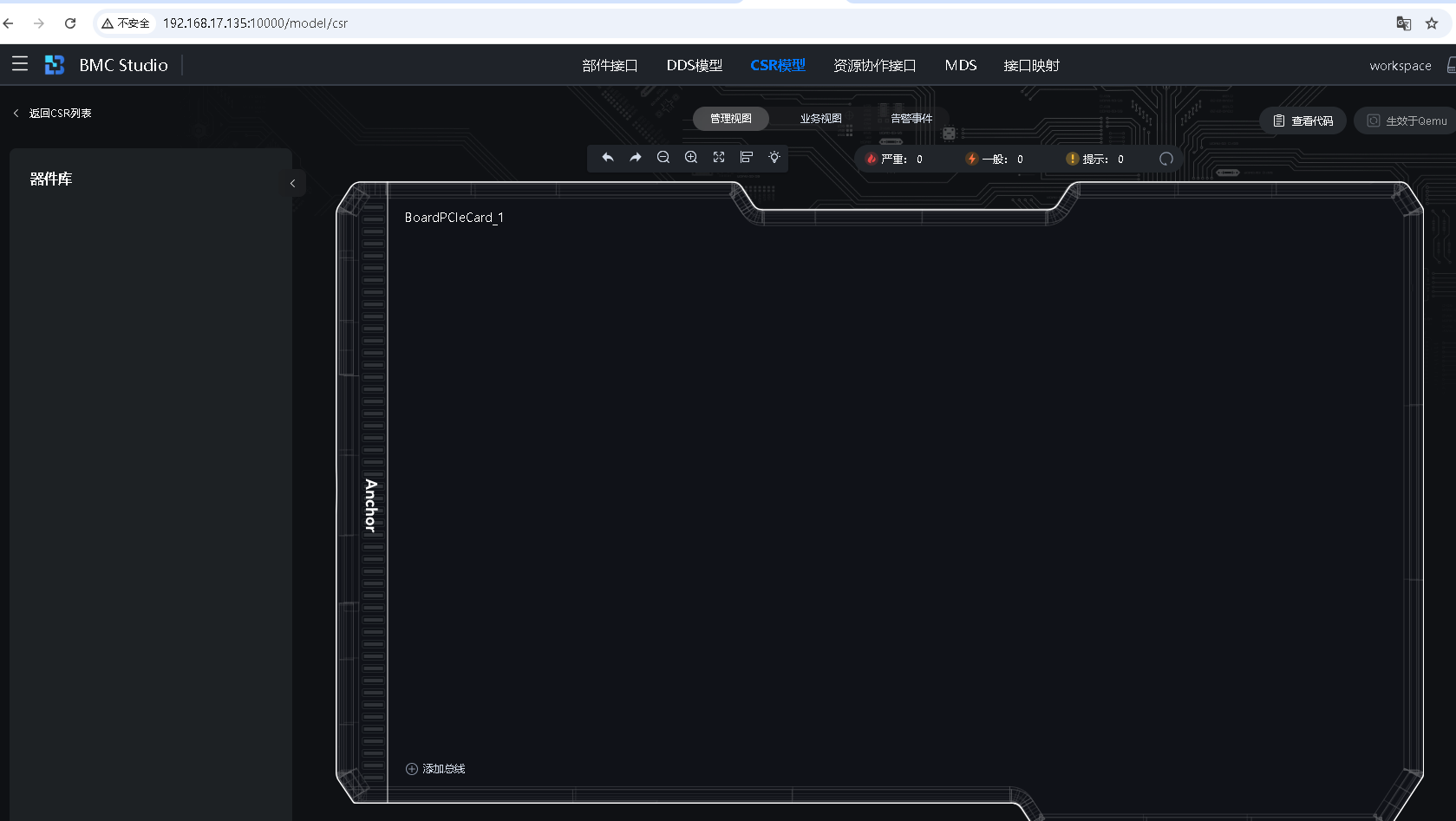 - 页面可以正常打开,但左侧/中部未看到任何已存在的器件/组件条目与结构树(见截图)。