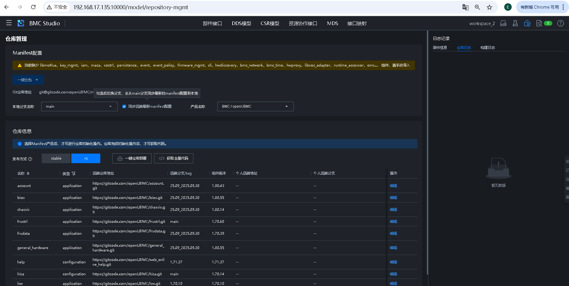 这个目前会有几个问题,使用场外环境bmcstudio,使用bingo,不使用bmcgo,不用高可用模块,只用开源代码,无任何代理,无多余操作,使用最新的manifest只做init.py初始化,然后切换到manifest 2509去编译构建,构建完成后,删除manifest,再去执行bmcstudio。