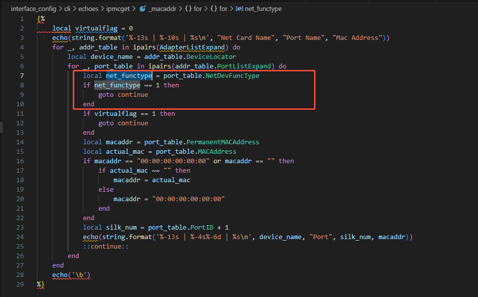 在您提供的代码片段和配置信息中,ipmcget -d mac 命令仅输出 NetDevFuncType(网络设备功能类型)为 1(即 Ethernet) 的端口 MAC 地址,这是由系统设计中的协议特性和应用场景决定的。