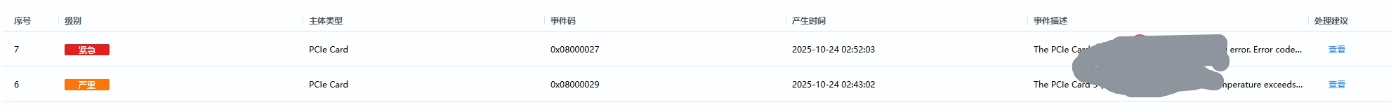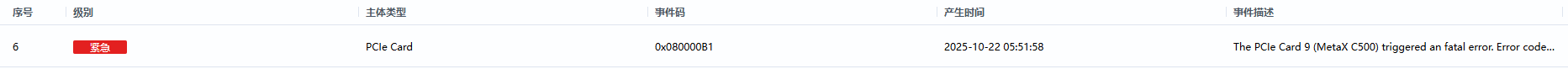 { "EventCode": "0x08000027", "ReportChannel": 65535, "OldEventCode": "", "EventType": 0, "LifeCycleId": 1, "DeassertFlag": 1, "EventKeyId": "PCIeCard.PCIeCardFatalErr", "SeverityId": 3, "ActionId": 0, "EventName": "PCIeCardFatalErr" }, { "EventCode": "0x08000029", "ReportChannel": 65535, "OldEventCode": "", "EventType": 0, "LifeCycleId": 1, "DeassertFlag": 1, "EventKeyId": "PCIeCard.PCIeCardHBMOverTemp", "SeverityId": 2, "ActionId": 0, "EventName": "PCIeCardHBMOverTemp" }
