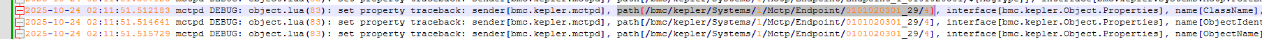 1970-01-01 03:44:24.475859 mctpd INFO: object_manage.lua(248): start to AddObject Endpoint_1_010101, owner:mctpd, path:/bmc/kepler/ObjectGroup/010101, position:010101, life_cycle_id:1, class_name:Endpoint