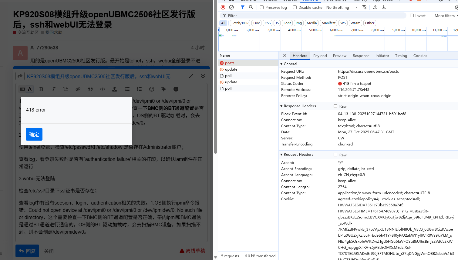 在使用社区发帖和回帖的时候,偶尔会碰到418,导致自己的帖子或者回复发不出去: