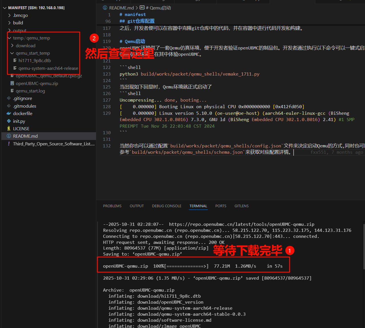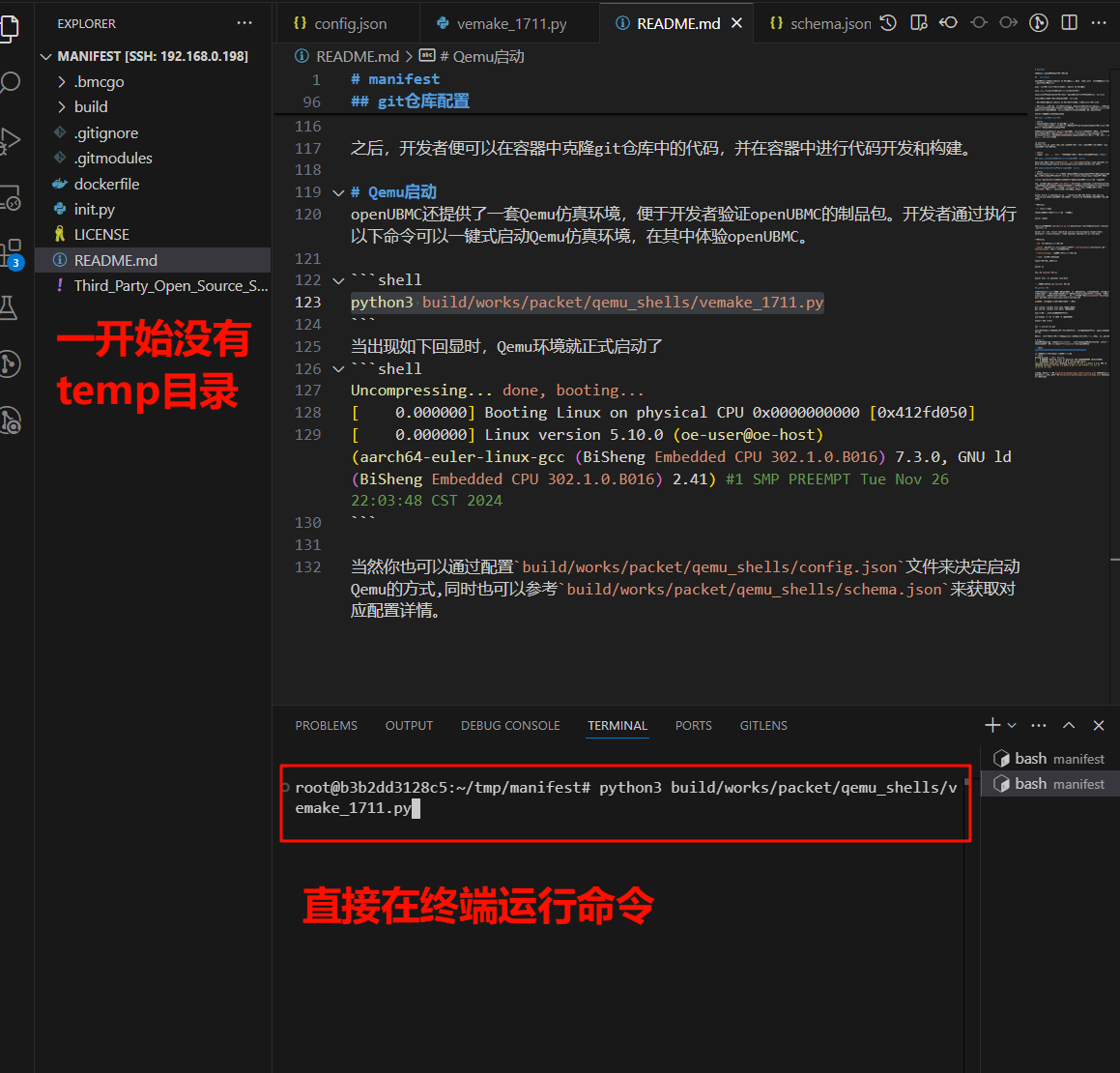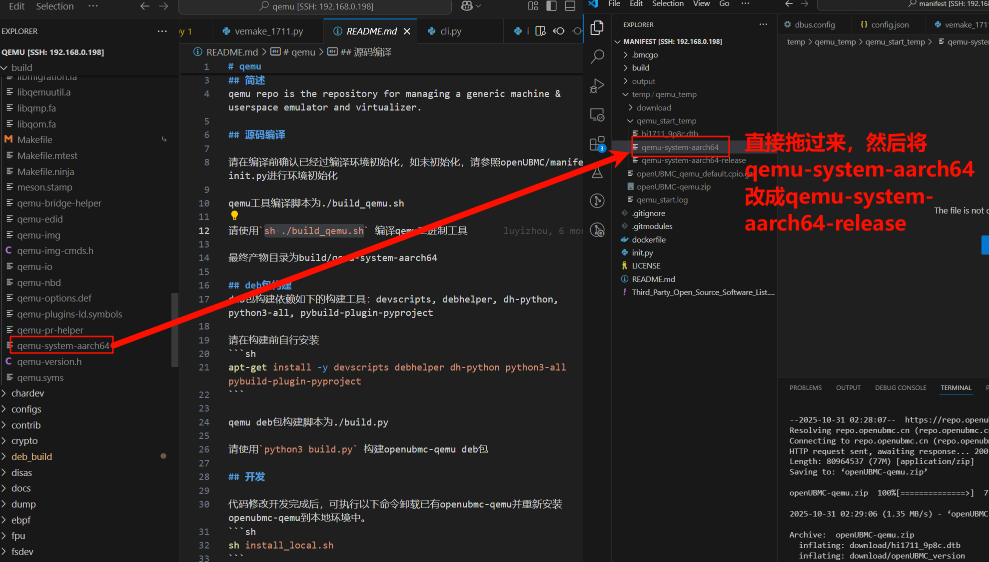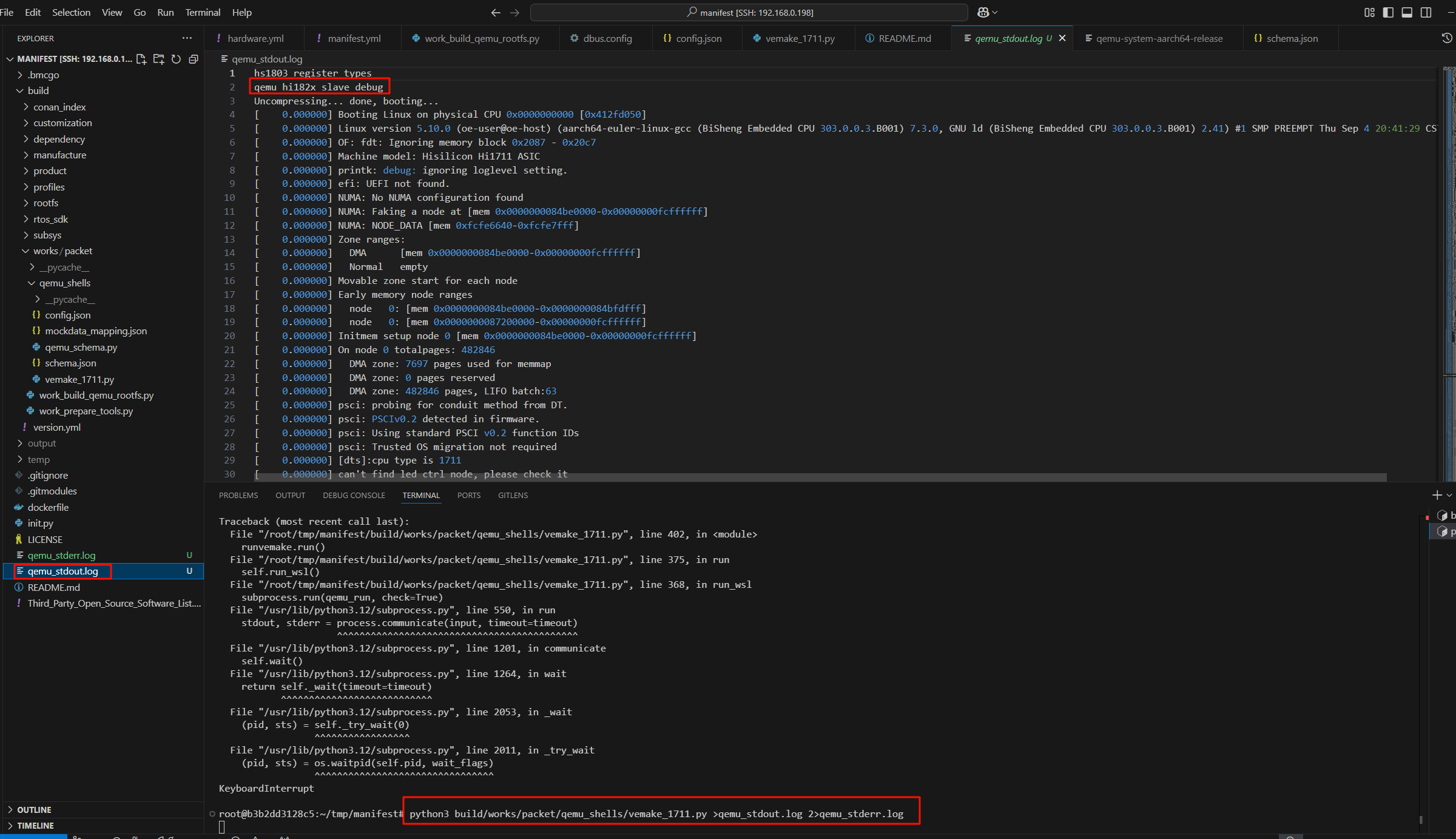- 将编译好的qemu-system-aarch64二进制迁移到manifest仓的temp/qemu_temp/qemu_start_temp,如果一开始找不到temp目录,那就执行python3 build/works/packet/qemu_shells/vemake_1711.py,等待temp目录构建出来,使用ctrl + C停止进程