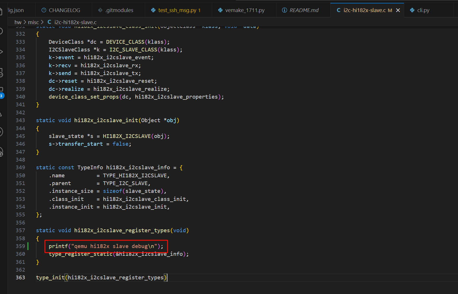 - 根据自己需求来修改对应的代码,如hw/misc/i2c-hi182x-slave.c添加一行调试日志