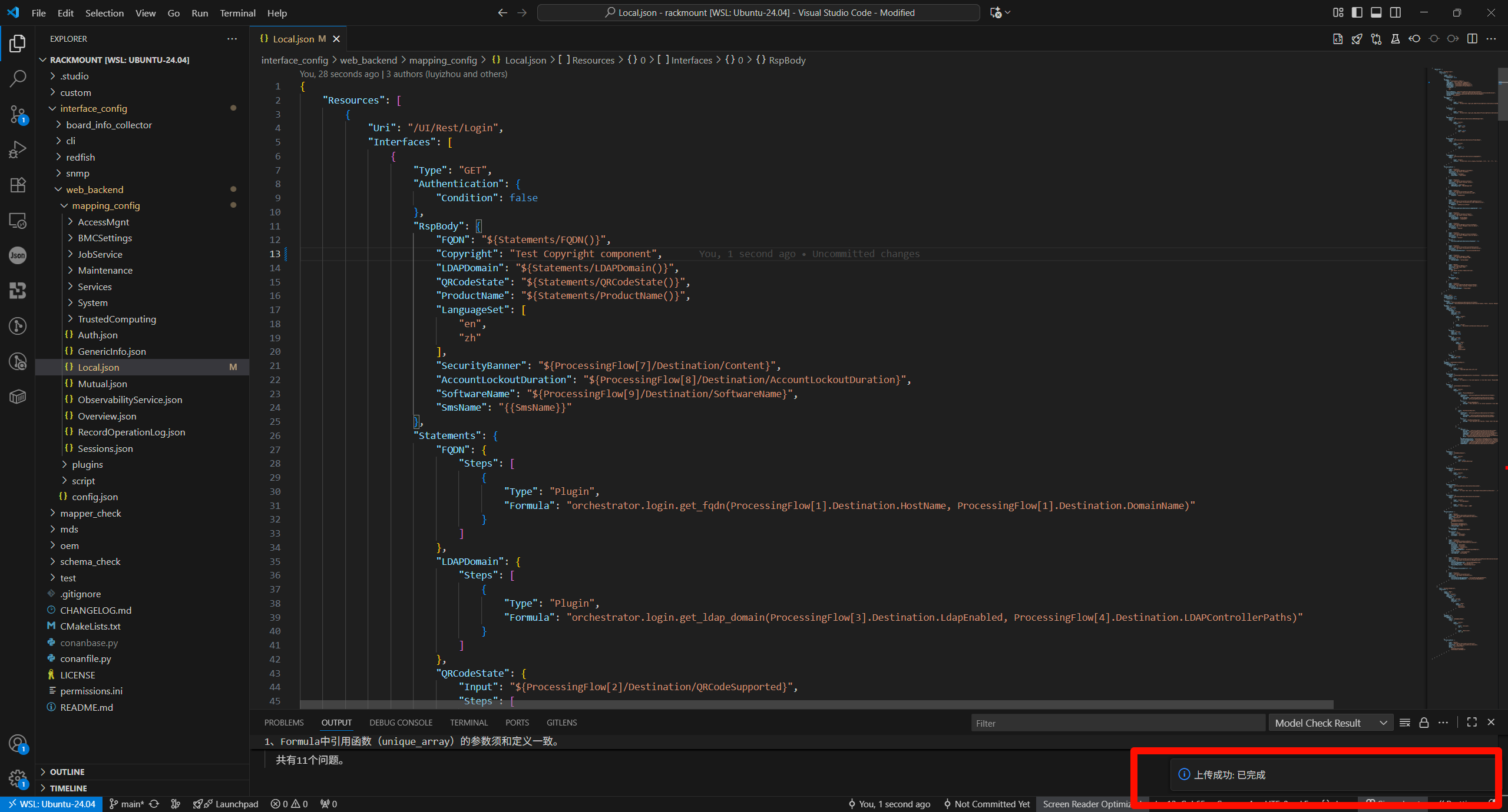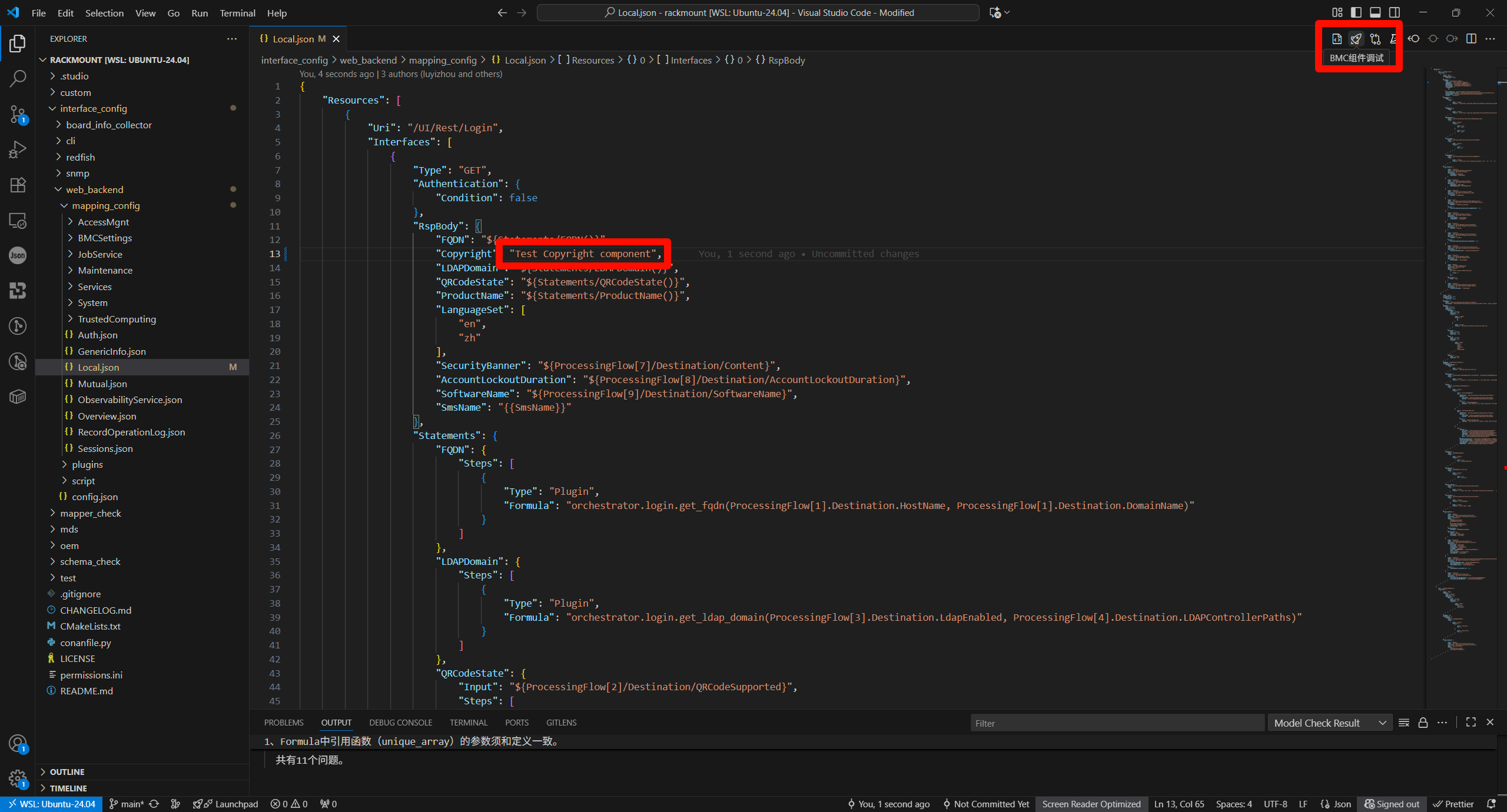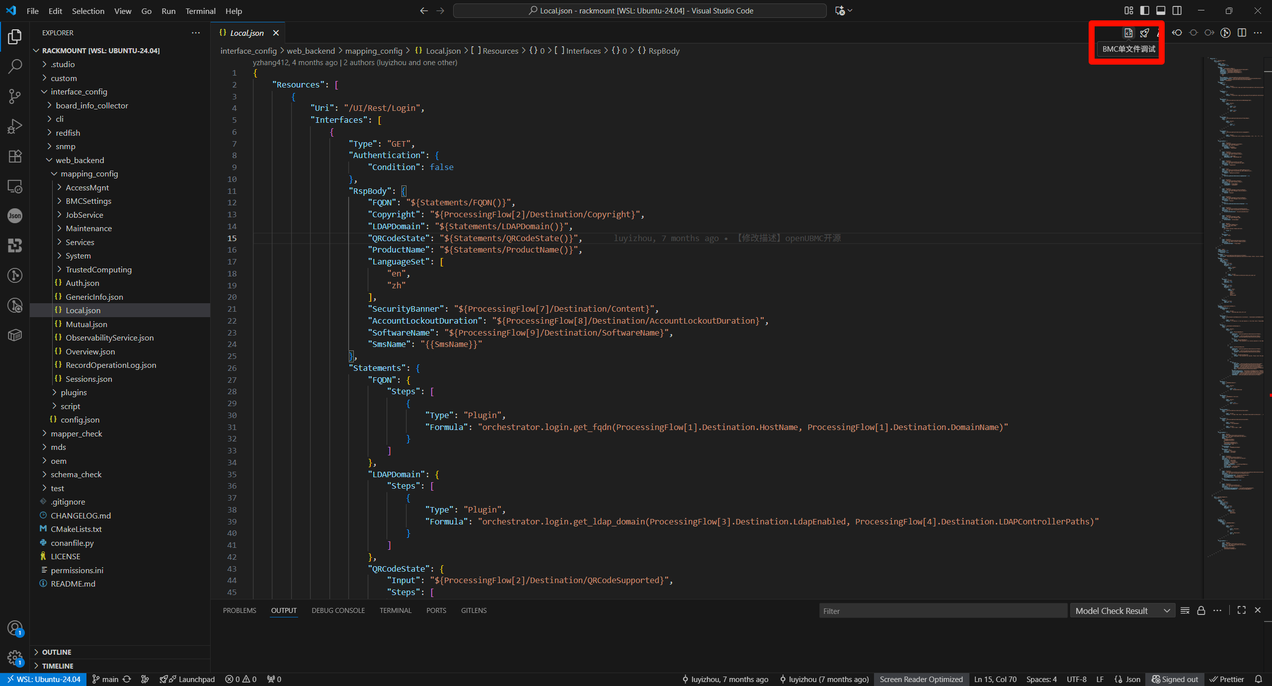 此时通过VsCode在openUBMC的组件代码仓下打开新窗口,以北向接口定制开发为例,打开rackmount文件夹,点开任意北向接口定制文件,即可在右上角看到两个图标,分别是文件级调试和组件级调试