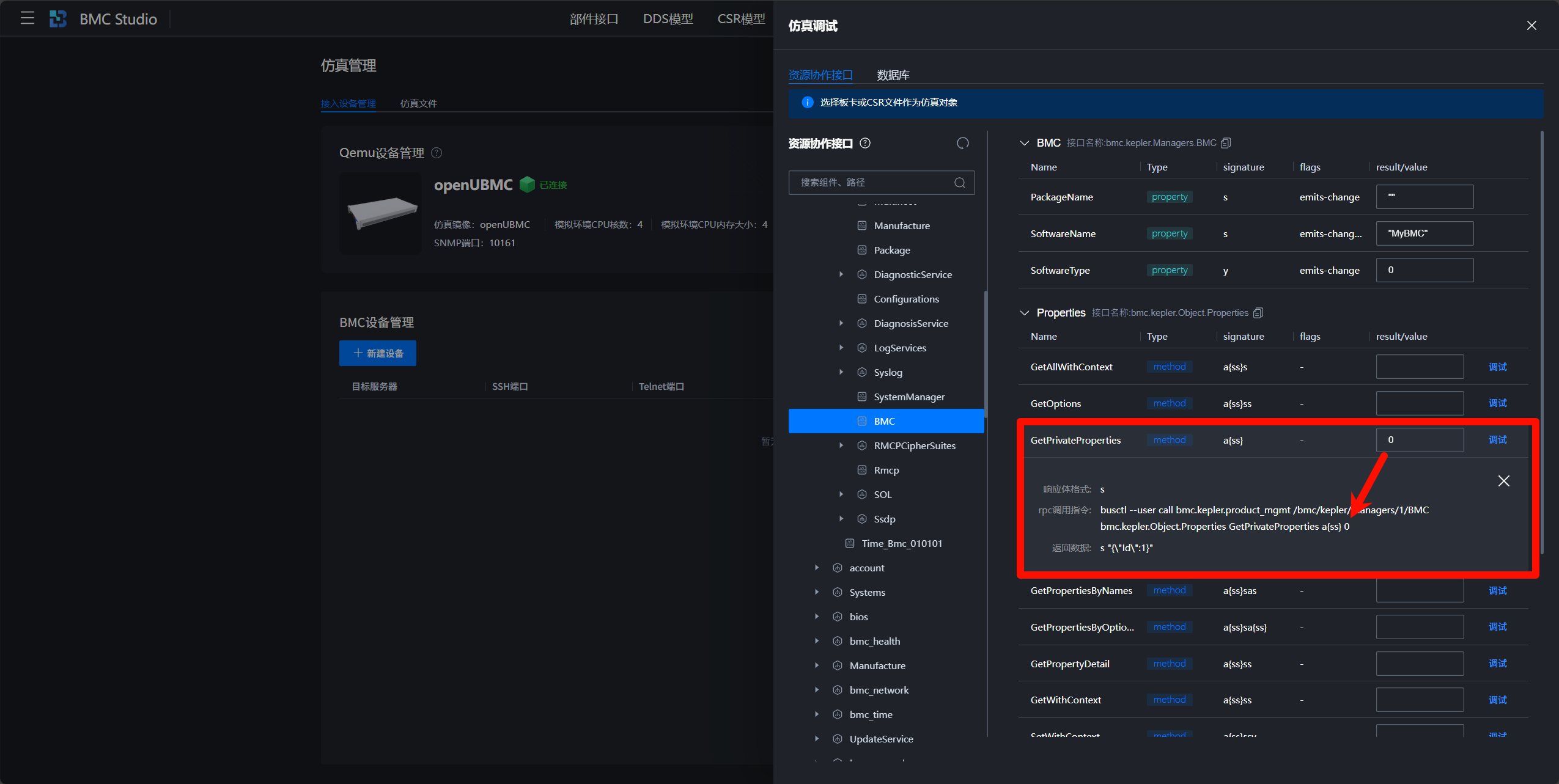 BMC Studio还简化了RPC调用过程,开发者只需要关注调用参数即可,无需关心完整命令的拼接,我们会帮您自动完成,展开接口,点击选择需要调用的RPC,在参数框中输入参数信息,点击右侧调试按钮,就会自动将下方拼接好的命令在BMC环境上执行,并返回结果,结果内容与命令行调用一致