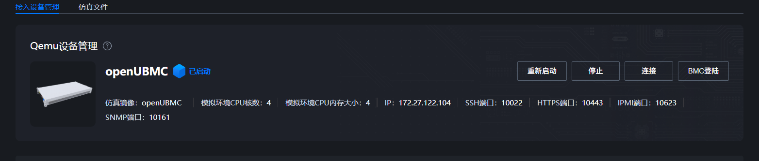 进入连接管理页面后,选择配置->社区镜像->openUBMC 点击启动,即可从社区获取Qemu镜像,启动Qemu,然后需要等待Qemu启动完成