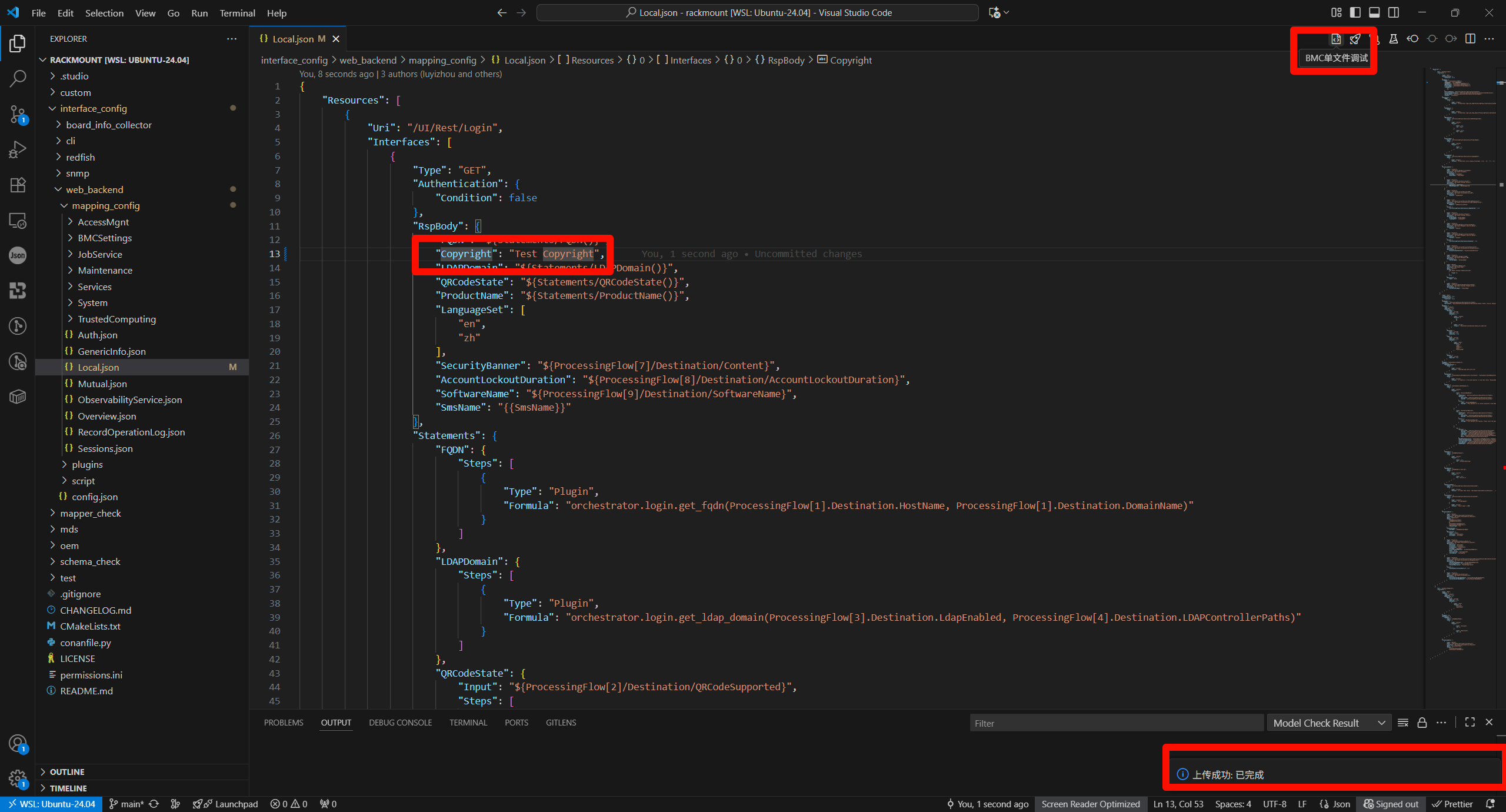 修改web_backend的接口,并启动调试,以Login接口的版权信息为例,修改后点击单文件生效: