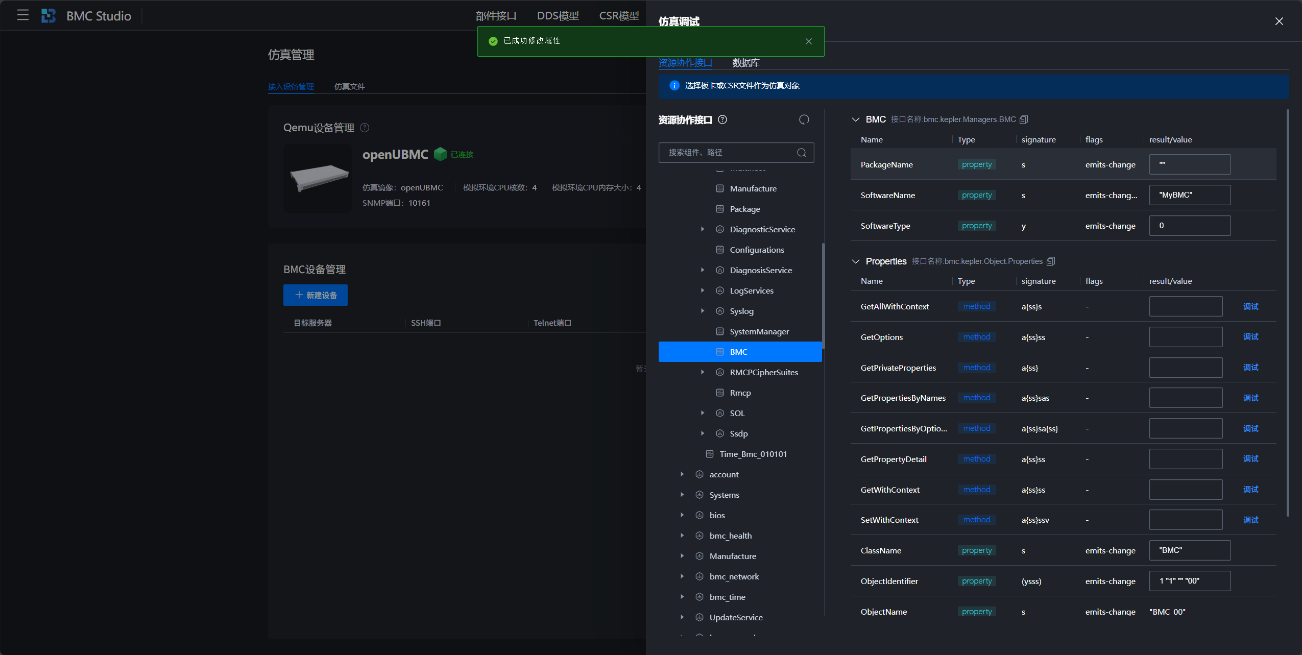 BMC Studio基于mdbctl命令封装了属性设置功能,点击属性框即可修改属性,修改完成后点击其他任意处,属性修改会自动生效,例如将openUBMC改为MyBMC