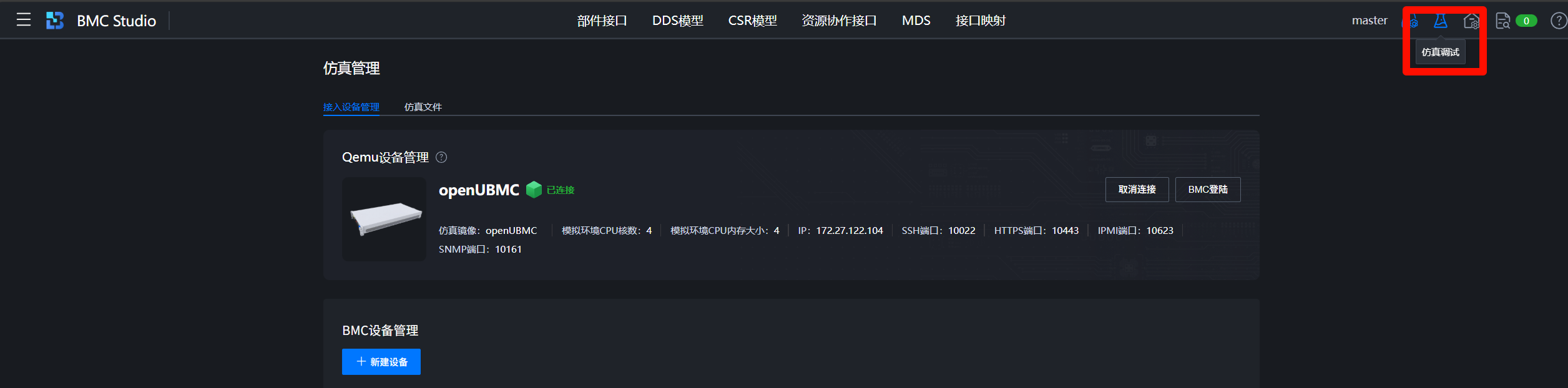 执行bingo studio -b即可以后台方式启动BMC Studio,进入BMC Studio页面,选择右上角仿真管理进入连接管理页面