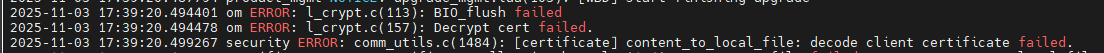 2025-11-04 10:04:32.429462 om ERROR: l_crypt.c(157): Decrypt cert failed.